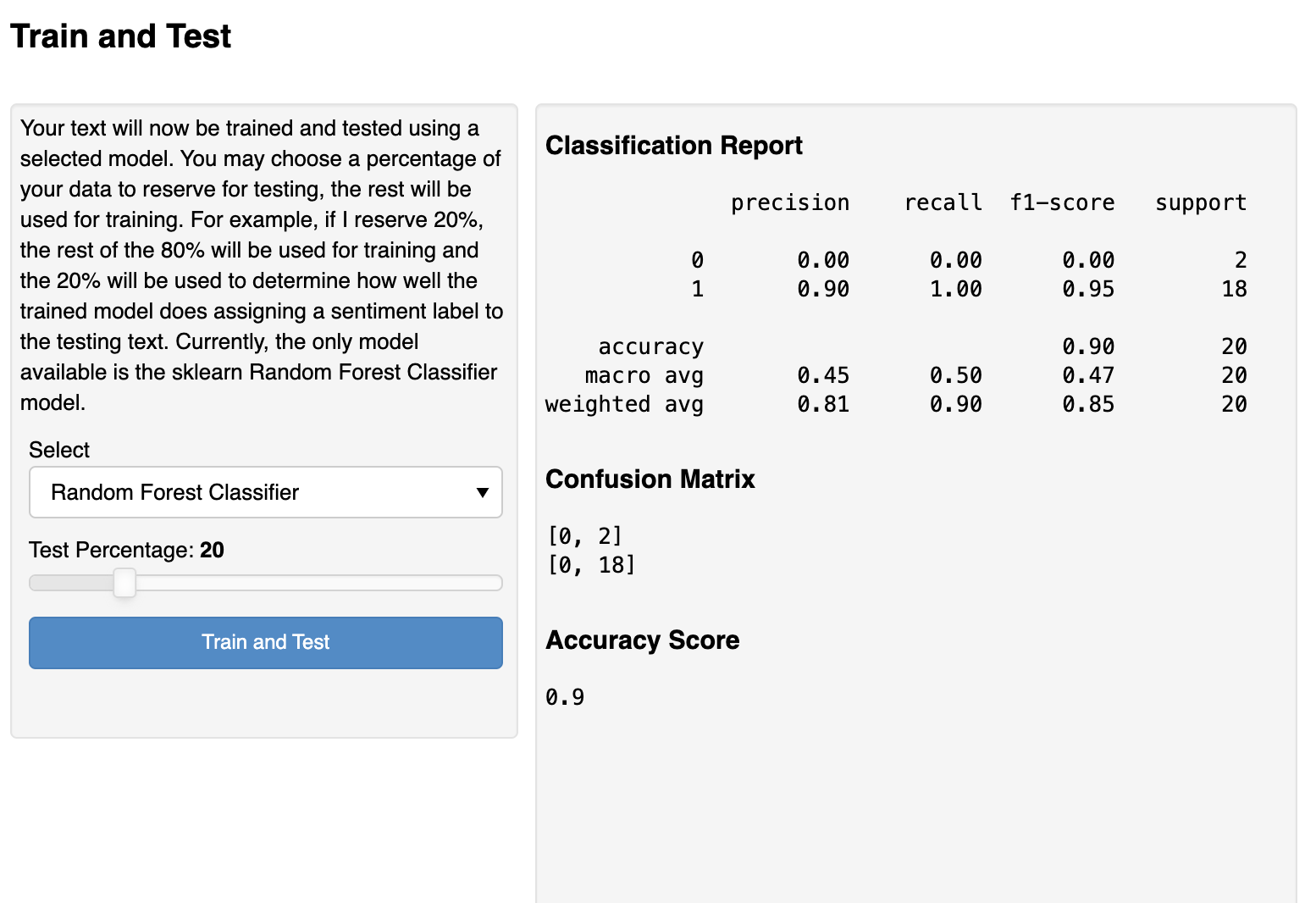 By clicking the Train and Test button, the model is processed. We can then see the results of the model in the pane on the right-hand side.