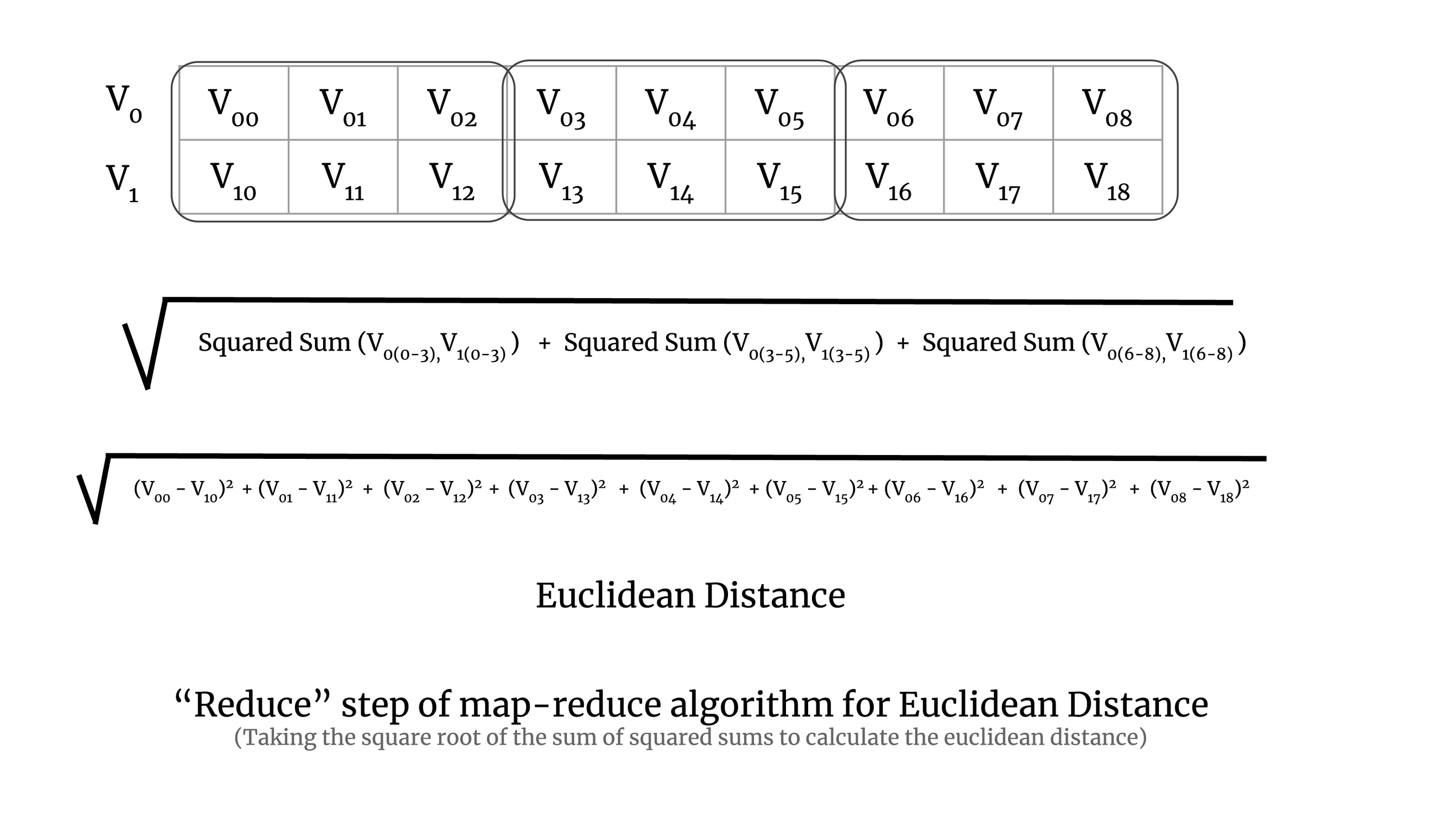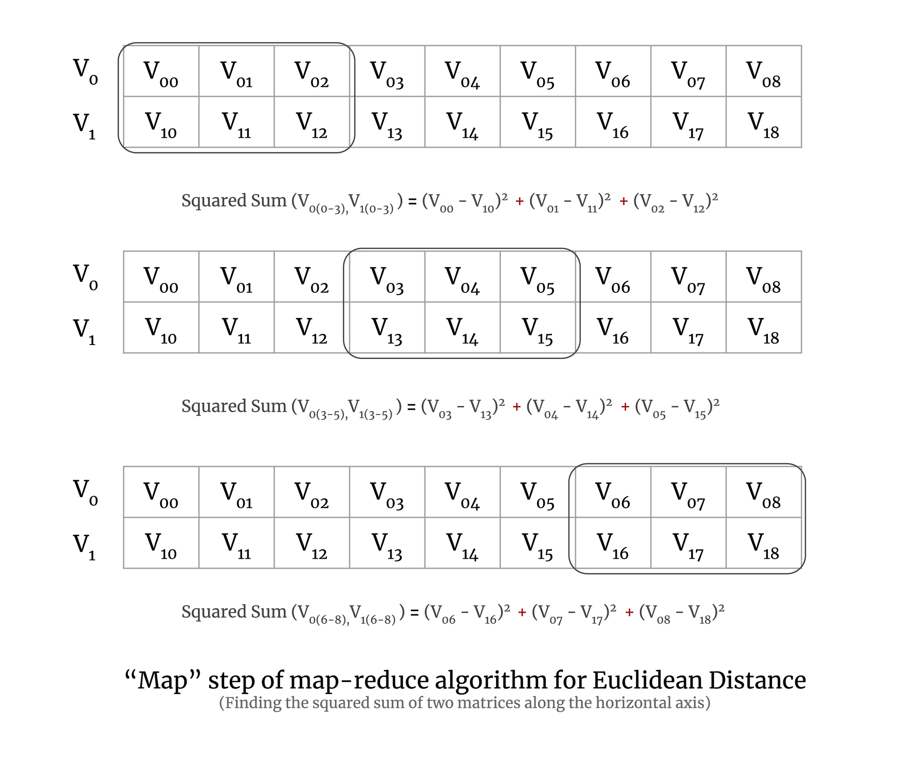 We calculate the map step of the computation on the chunk. To illustrate this, consider Euclidean distance. The Euclidean distance for a pair of vectors V0 and V1 is defined as the square root of