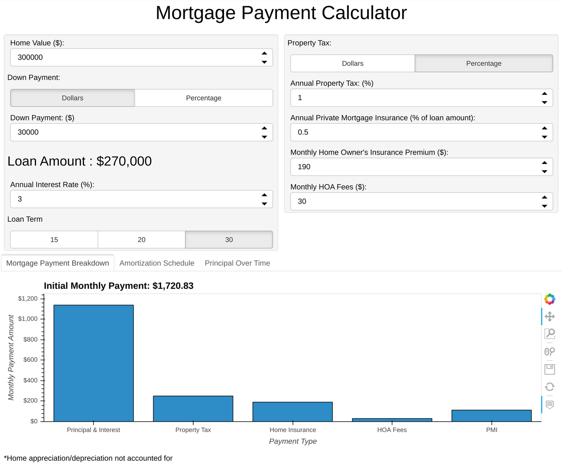 Try out the app below. It's a mortgage calculator app allowing you to see your mortgage payment, amortization schedule, and principal paid over time.